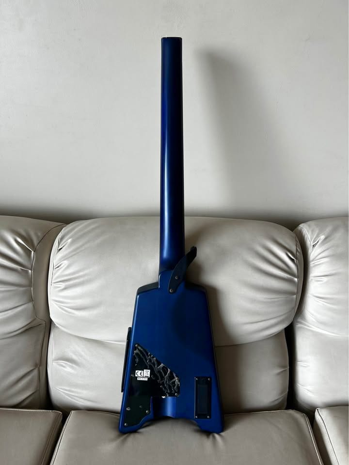 Guitarra headless Steinberger Synapse ST-2FPA en acabado azul translúcido, con EMG 81/85 activos, escala barítono 28.5”, sliding capo integrado y hardware negro. Excelente estado.